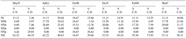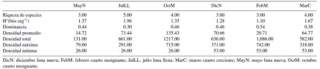 En DicND se registraron valores intermedios de riqueza de especies (4) y densidad (1,775 org m-2), valor de diversidad bajo (1.13 bits org-1) y el más bajo de dominancia (0.41). En JulLL, DicN, FebM y MarC las muestras se recolectaron en NI, ND, NDb y NNb; durante OctM y JulLL en NI, ND NNp, NNb y NDb (tabla 2). En OctM el porcentaje máximo de contribución de núcleos fue por NNb, en esta fase el ancho de la zona no saturada en la zona mesolitoral fue mayor (de 18 a 33 m); sin embargo, el porcentaje máximo de contribución a la densidad total lo aportaron los NNp. Durante MayN, JulLL, DicN, FebM y MarC el máximo porcentaje de contribución de los núcleos y la densidad total fue por ND, debido a que durante estas fases el ancho de zona no saturada en la zona intermareal fue menor.