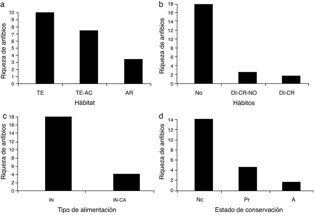 En los distintos atributos de historia natural analizados para los anfibios (fig. 5a; tabla 2) se encontró que del total de las especies, 10 —una salamandra y 9 anuros— son terrestres (50%), 7 —una salamandra y 6 anuros— son terrestres-acuáticas (35%) y 3 anuros son arborícolas (15%). Respecto a los hábitos (fig. 5b), 17 especies de anuros son nocturnas (85%), 2 —una salamandra y un anuro— son diurnas-crepusculares-nocturnas (10%) y una especie de anuro es diurna-crepuscular (5%). Se registran 17 anuros insectívoros (85%) y 3 especies —una salamandra y 2 anuros— insectívoras-carnívoras (15%; fig. 5c). El tipo de paridad encontrado para las 20 especies es ovíparo.
