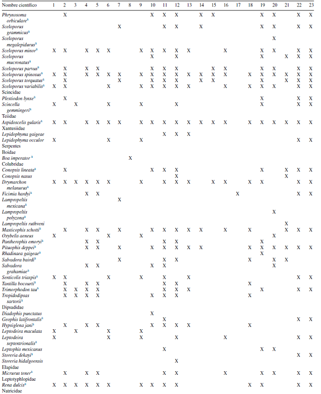 Relación de especies y referencias bibliográficas para la herpetofauna de la zona árida de Hidalgo: 1) Altamirano-Álvarez, Mendoza-Quijano, Marmolejo-Santillán y García-Collazo, 1993; 2) Camarillo-Rangel, 1993; 3) Campos-Rodríguez et al., 2010; 4) Fernández-Badillo, 2008; 5) Fernández-Badillo y Goyenechea, 2010; 6) Gelover-Alfaro et al., 2000; 7) Gómez-Mendoza, 2007; 8) Goyenechea et al., 2010; 9) Hernández-Pérez, 1997; 10) Hernández-Salinas, 2009; 11) Huitzil-Mendoza, 2010; 12) Lara-Parra, 2014; 13) López-Mejía, 2011; 14) Martín del Campo, 1936; 15) Martín del Campo, 1937; 16) Mendoza-Quijano, 1990; 17) Mendoza-Quijano y Smith, 1993; 18) Morales-Capellán, 2010; 19) Ramírez-Bautista et al., 2010; 20) Ramírez-Bautista et al., 2014; 21) Roth-Monzón, 2010; 22) Vite-Silva, 2008, y 23) Vite-Silva et al., 2010.