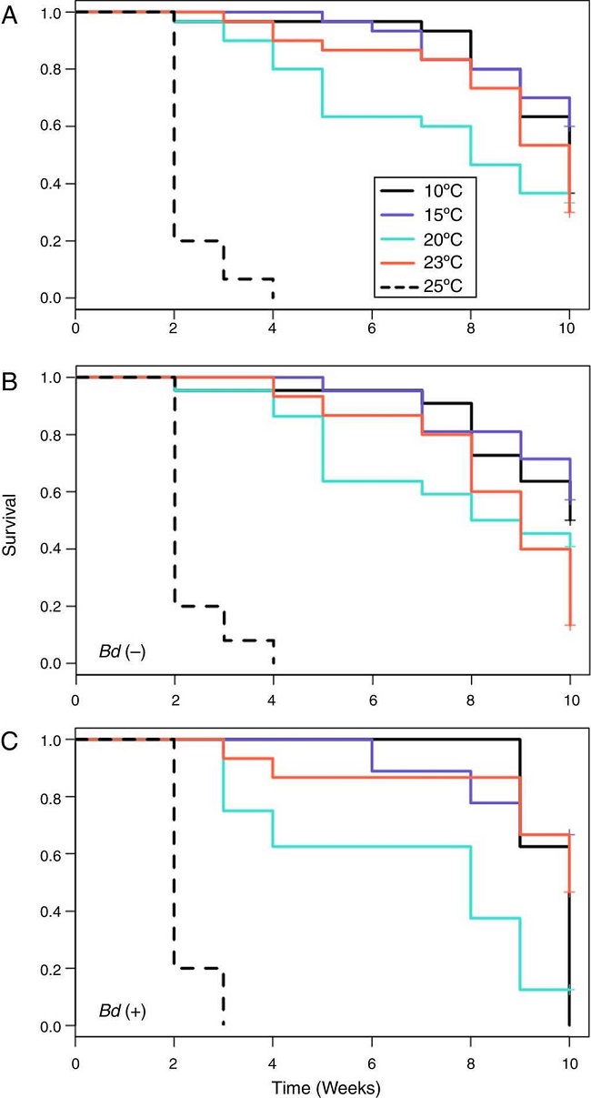 Elevated host body temperatures have been shown to clear frogs of Bd infection. Woodhams, Alford, and Marantelli (2003) and Rowley and Alford (2013) showed that individual probabilities of infection by Bd decreased strongly with an increasing percentage of body temperatures above 25 °C in tropical species. For P. leprosa, the 3 survival analyses revealed that 25 °C is a critical temperature for the survival of these organisms and identified this temperature as the most important factor influencing the survival of the salamanders rather than infection by Bd; therefore, both the pathogen and the host are negatively affected by temperatures of 25 °C or higher.