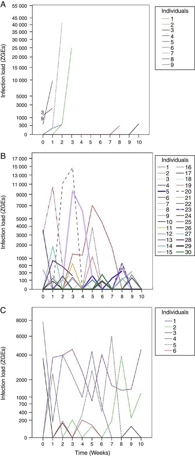 Although environmental conditions in La Malinche are favorable for the survival of P. leprosa with a low prevalence of Bd, when the salamanders were exposed to temperature experiments and conditions ideal for Bd growth, 33 new cases of infection were detected, indicating that these salamanders had subclinical levels of infection in the field. Over the course of the experiments, we observed variations in the infection loads, and the salamanders exhibited cycles of increasing and decreasing ZGEs over time. A similar pattern was described by Shin, Bataille, Kosch, and Waldman (2014), who found that the ZGEs of individual frogs significantly varied over a 5-day period because they intermittently released zoospores. Our results might also reflect cycles in the release of Bd zoospores; however, we cannot rule out the effects of the defense mechanisms of the 19 individuals that expressed Bd once and were then Bd negative for the remainder of the experiment.