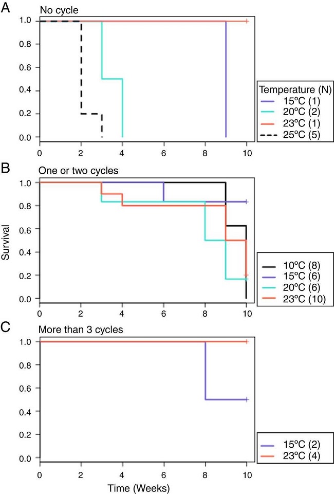 When all of the individuals were included in the analyses, the Kaplan-Meier survival analysis showed significant differences between temperatures ( = 59.4, DF = 4, p < 0.001) (Table 3) and Cox's proportional risk models using the 10 °C treatment as a reference revealed significant differences in survival with the treatment at 25 °C (LRT = 68.8, DF = 4, p < 0.001), which had a risk rate of 63.5 (Table 3, Fig. 1 A)