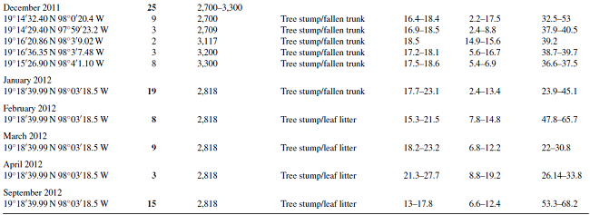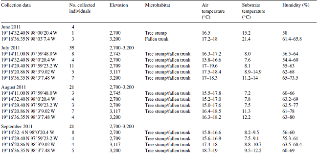 Over the 15 visits to La Malinche National Park from June 2011 to September 2012, we collected 160 adult P. leprosa (Table 1). Information on the microhabitat, specific locality, and ambient temperatures are provided in Appendix.