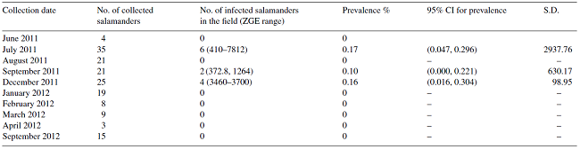 Our results show that only 12 (7.5%) of the salamanders were infected with Bd in the months of July, September, and December, and the prevalence was low in all 3 months, with values of 0.17, 0.09, and 0.16, respectively. The highest infection load in the field was 7812 ZGEs, which was observed in 1 individual in July (Table 1).