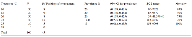 The number of infected salamanders and the infection loads appeared to differ across treatments (Table 2), although the nonparametric ANOVA did not reveal significant differences (p ≥ 0.05) in the infection load between the 10, 15, 20, 23 and 25 °C temperature treatments. This result led us to reject the hypothesis that the degree of infection is temperature dependent.