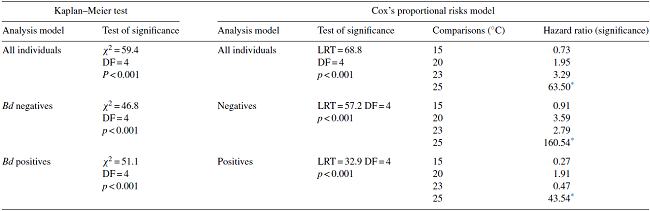 For the Bd-negative group, the Kaplan-Meier analysis also showed a difference in the probability of survival (χ 2 = 46.8, DF = 4, p < 0.001), Cox's proportional risk models showed significant differences with the treatment at 25 °C (LRT = 57.2, DF = 4, p < 0.001), and the hazard ratio for this treatment was 160.54 (Table 3, Fig. 1 B). For the Bd-positive group, the Kaplan-Meier analysis indicated significant differences (χ 2 test = 51.1, DF = 4, p < 0.001), whereas Cox's proportional risk models showed significant differences with the treatment at 25 °C (LRT = 32.9, DF = 4, p < 0.001), with a hazard ratio of 43.54 (Table 3, Fig. 1 C).