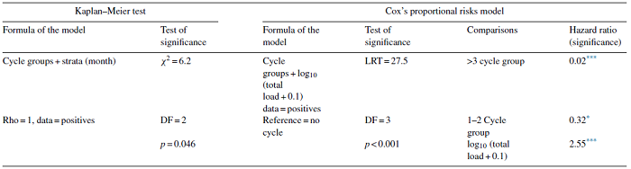 To understand the relationship between infection load and survival in P. leprosa, the salamanders were classified into 3 groups: (1) the No-Cycle group, which included animals in which the infection load was either maintained or increased over time; (2) the 1-2 Cycles group, which included animals in which the infection load decreased/increased once or twice, and (3) the >3 Cycles group, which included animals in which the infection load decreased/increased 3 or more times. Using these data, we tested the hypothesis that survival depends on the ability to clear or reduce Bd infection. For these analyses, we also applied the Kaplan Meier analysis and Cox's proportional risk model. We included the cumulative number of zoospores over the course of the experiment (i.e., the sum of the ZGEs for 10 weeks) as an additional variable to explain the risk of mortality in Cox's proportional risk model.