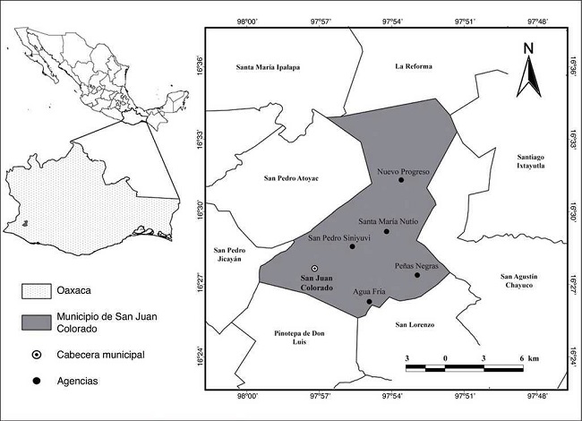 El municipio de San Juan Colorado se localiza en el estado de Oaxaca, entre los meridianos 97°52′12″ y 97°55′12″ N, y los paralelos16°34′48″ y 16°25′48″ O, a una altitud entre 200 y 1,500 m snm. Tiene una superficie aproximada de 86 km2, el clima es predominantemente cálido subhúmedo, con una temperatura media anual de 22 a 28 °C y una precipitación anual de 1,500 a 2,500 mm. Está dividido políticamente en 6 agencias municipales; Agua Fría, Nuevo Progreso, Peñas Negras, San Juan Colorado —cabecera municipal—, San Pedro Siniyuvi y Santa María Nutío. Pertenece a la provincia biogeográfica sierra Madre del Sur, en la región Costa del Pacífico (Inegi, 2005) al sur del distrito de Putla. Limita al norte con el municipio de Reforma; al sur con los municipios de Pinotepa de Don Luis y San Lorenzo; al oeste con San Pedro Atoyac y San Pedro Jicayán y al este con San Agustín Chayuco y Santiago Ixtayutla (fig. 1) (Inegi, 2005). En el municipio se presentan 9 tipos de vegetación (sensuRzedowski, 1978): bosque de pino-encino, bosque de encino, bosque mesófilo de montaña, bosque tropical caducifolio, bosque tropical subcaducifolio, bosque de galería, matorral, pastizal y vegetación acuática.