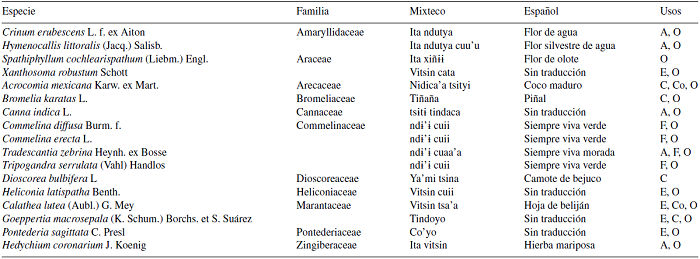 San Juan Colorado pertenece a la región de la Mixteca Baja, lugar en el que se han conservado diversas costumbres y tradiciones regionales, además de su lengua originaria, el Mixteco. Algunas de las habilidades artísticas de los mixtecos se pueden apreciar en las servilletas, rebozos, manteles, etc., que las mujeres fabrican en telares de cintura, utilizando como material principal el algodón coyuchi. Los miembros de esta comunidad indígena aprovechan muchos de los recursos naturales de su entorno y muestra de ello es el uso que tradicionalmente le dan a las plantas. En este trabajo se recopiló la información etnobotánica acerca de las especies de monocotiledóneas usadas en la comunidad, además de registrar sus nombres en mixteco. Encontramos 17 taxa con alguna utilidad, agrupados en 11 familias y 16 géneros, 14 (82%) especies con uso ornamental, 5 (29%) usadas para embalaje, 4 (24%) como forraje y comida, 2 (12%) para construcción y 6 (35%) con algún uso artesanal-ritual (tabla 2).