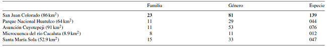 En la tabla 4 se comparan los resultados de este trabajo con los obtenidos para otras áreas del estado de Oaxaca que han sido estudiadas desde el punto de vista florístico, como el Parque Nacional Huatulco (Salas-Morales, Schibli, Nava-Zafra y Saynes-Vásquez, 2007) con 64 km2 y registros de 11 familias, 29 géneros y 44 especies; para el municipio de Asunción Cuyotepeji con 91 km2 y registros de 11 familias, 53 géneros y 76 especies (Solano-Hernández, 1997); para la parte baja de la microcuenca del río Cacaluta, con 8.9 km2 y 8 familias, 11 géneros y 12 especies (Domínguez-Licona, Domínguez-Licona y Domínguez-Licona, 2008) y para el municipio de Santa María Sola (Mendoza-Díaz, 2012) se registraron 15 familias, 33 géneros y 47 especies, en solo 52.9 km2. Como puede apreciarse, San Juan Colorado con 86 km2, presenta casi el doble de familias (23), un número considerablemente mayor de géneros (81) y muchas más especies (139).