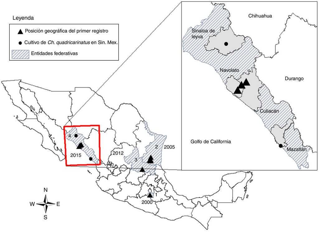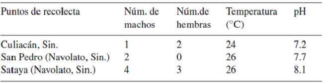 Como parte de un estudio sobre la diversidad de crustáceos en el río Culiacán, se recolectaron 12 ejemplares adultos de C. quadricarinatus en presa derivadora, Culiacán, Sinaloa (24°48′23.9′’ N; 107°24′50.4′’ O); San Pedro (24°47′06.1” N, 107°33′22.1” O) y Sataya (24°37′48.6” N, 107°39′41.1” O), Navolato, Sinaloa (fig. 1). De los 12 individuos recolectados 5 fueron hembras y 7 machos (tabla 1), representando el primer registro en el estado de Sinaloa de dicha especie en condiciones silvestres, en donde algunos parámetros fisicoquímicos como temperatura y pH durante la inspección de campo oscilaron en un rango de 24 a 26 °C y 7.2 a 8.1, respectivamente. En la figura 2 se muestran 2 ejemplares, uno de ellos con el parche rojo en las quelas, carácter distintivo de la especie (Snovsky y Galil, 2011).