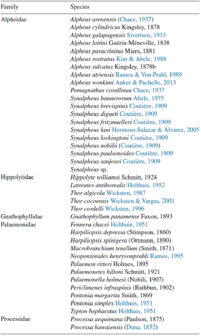 The 2 best-represented genera of caridean shrimps from Bahía Chamela (Synalpheus with 10 species and Alpheus with 9 species) are among the most diverse and abundant in tropical oceans (Anker, Ahyong, Noël, & Palmer, 2006). They are particularly important for studies on symbiosis with other species of vertebrates (e.g., Randall, Lobel, & Kennedy, 2005) and invertebrates (e.g., Silliman, Layman, & Altieri, 2003). Species of these 2 genera live in a wide variety of habitats, although they are mostly associated with corals, tidal pools, burrows in sand and muddy substrates, and in symbiosis with some invertebrates (Kim & Abele, 1988). Particularly, in Bahía Chamela these species were found commonly associated with living corals of the genus Pocillopora, polychaete-tube reefs, rocks, and dead corals. One species, S. paulsonoides, was found in sandy substrates. However, the diversity of these snapping shrimp in the area is probably higher and other specific microhabitats (e.g., sponges, sea anemones, ascidians) should be explored in order to detect the presence of more species.