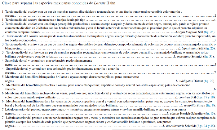 El género Largus Hahn, 1831 se caracteriza por tener las coxas anteriores sin espinas, los ojos ligeramente pedunculados y estilizados y el corium centralmente ampliado (Distant, 1880-1893). Incluye 61 especies válidas, distribuyéndose desde el norte de los Estados Unidos de América hasta el centro de Argentina -específicamente llegando hasta la provincia del Monte-, abarcando las Antillas Mayores y Menores (Stehlík y Kment, 2010). Sus especies son de hábitos fitófagos, y habitan generalmente el suelo, la hojarasca y plantas herbáceas, arbustos y árboles (Schuh y Slater, 1995). Schmidt (1931) dividió el género Largus en 2 grupos: «grupoI» de especies con el fémur posterior sin espinas; y «grupo II» de especies con los fémures posteriores espinados. Posteriormente, subdividió el primer grupo de acuerdo con la coloración del metatórax: «I. A», con el esternito pleural posterior III blanquecino, y no correspondiendo a la coloración del resto del tórax; y «I. B», con el esternito pleural posterior III de la misma coloración que el resto del tórax (Stehlík y Kment, 2010). El grupo «I. A» únicamente se conoce en América del Sur, y el grupo «I. B» es de amplia distribución (Schmidt, 1931). Las especies revisadas en este trabajo corresponden al grupo «I. B», distribuidas desde el sur de los Estados Unidos de América hasta Colombia. De las 61 especies que conforman el género Largus solo 8 han sido citadas para México. La variación cromática es considerada como un carácter polimórfico por diversos autores, lo que llevó a problemas de sinonimizar especies diferentes. A manera de síntesis, Halstead (1972b) consideró a L. sculptilis Bliven como sinónimo junior de L. cinctus Herrich-Schaeffer y a L. semipletus Bliven con L. cinctus Herrich-Schaeffer. A su vez, Bliven en 1973 consideró a L. cinctus Herrich-Schaeffer, L. convivus Stål y L. longulus Stål como sinónimos junior de L. succinctus (Linnaeus); de igual manera a L. semipunctatus Halstead con L. sculptilis Bliven. El presente trabajo tiene como finalidad delimitar correctamente las especies mexicanas del género Largus, ampliar su distribución geográfica y elaborar una clave dicotómica para la identificación de las mismas.