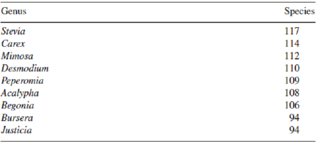 Table 4 shows the 25 families and genera with the most species. Comparing these lists with those provided by Villaseñor (2004), only Bignoniaceae, Cucurbitaceae and Scrophulariaceae are excluded, which were listed before among the families of angiosperms with the largest numbers of genera (Villaseñor, 2004). Notably, this list now also includes a family of ferns (Pteridaceae). Moreover, all genera with the largest numbers of species (Villaseñor, 2004) continue to be ranked highest; the only exception is the genus Opuntia, which was reduced from 90 to 72 species due to the segregation of the genus Cylindropuntia (18 species).