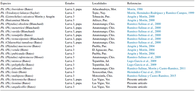 El género Phyllophaga está representado en México por 387 especies, la mayoría restringidas a localidades de montaña; solo 20 de ellas muestran amplia distribución en el país, a veces con extensiones hacia América Central y del Sur o al sur de los Estados Unidos de América (Morón, 1986, 2003, 2010). De esta notable diversidad solo se han descrito las larvas de 22 especies (tabla 1), que en su mayoría se encuentran con frecuencia en terrenos cultivados, donde forman parte de un complejo de especies popularmente conocidas como «gallina ciega». En México este complejo incluye más de 1,200 especies de Melolonthidae y Cetoniidae, incluyendo a Phyllophaga, la mayor parte de las cuales no se alimentan con raíces y no afectan a los cultivos pero sí contribuyen a optimizar las condiciones del suelo (Morón, 2010). Para lograr un programa exitoso de manejo de plagas subterráneas es indispensable la identificación precisa de las especies asociadas al cultivo y el estudio de sus hábitos y ciclos de vida (Ramírez-Salinas, Morón y Castro-Ramírez, 2000; Morón y Rodríguez-del Bosque, 2010). En este sentido es recomendable evaluar la composición específica del complejo «gallina ciega» en cada localidad, para evitar o disminuir los efectos de los medios de control sobre las poblaciones de especies benéficas. Con el propósito de incrementar los recursos para la identificación de la fauna edafícola de México, en este trabajo se presentan las descripciones de las larvas de tercer estadio de Phyllophaga heteronycha (Bates), P.leonina (Bates) y P.angulicollis (Bates), con datos comparativos de las larvas de primero y segundo estadio, así como las descripciones de las pupas de las 2 primeras especies, con observaciones sobre su ciclo vital y sus hábitos.