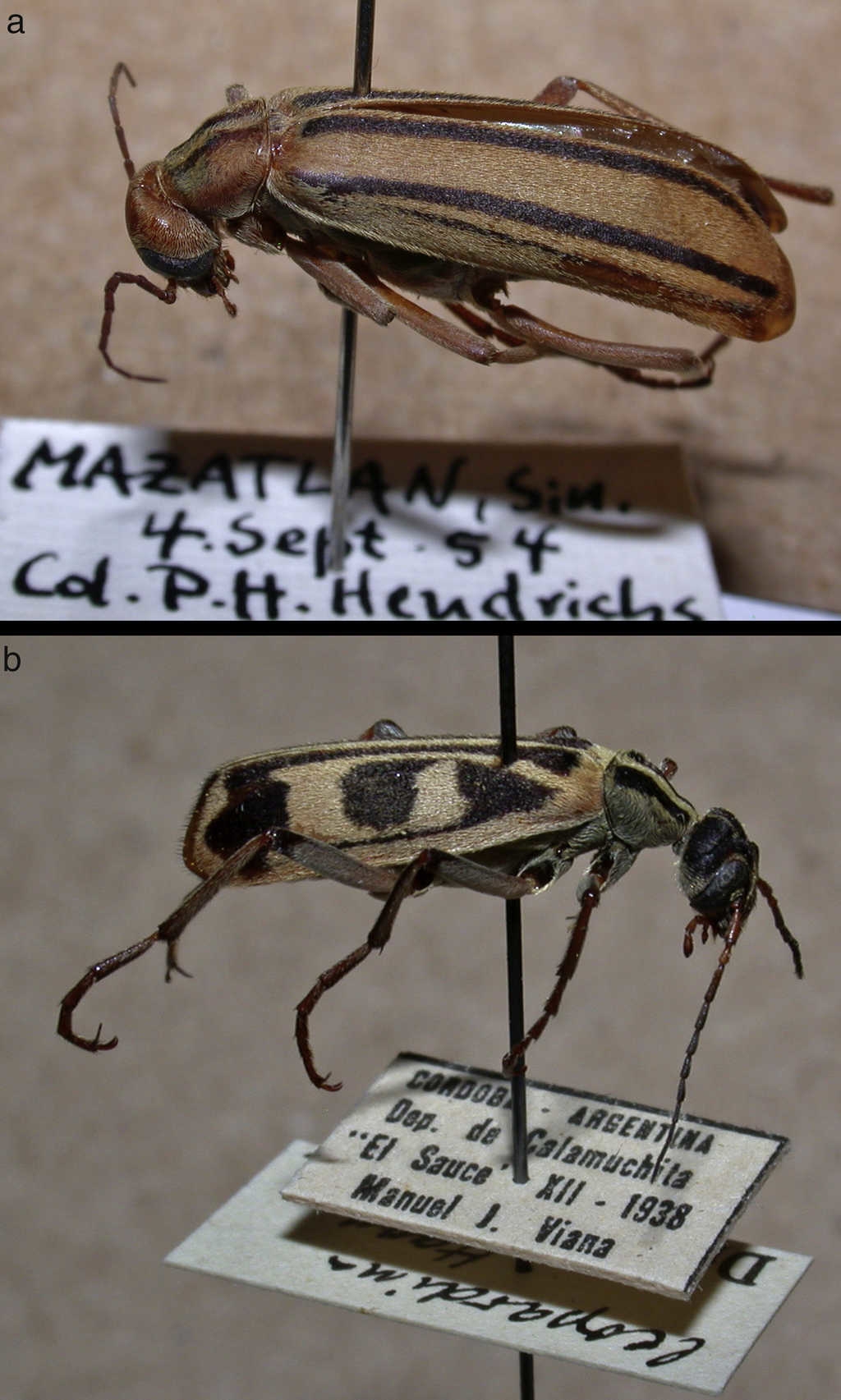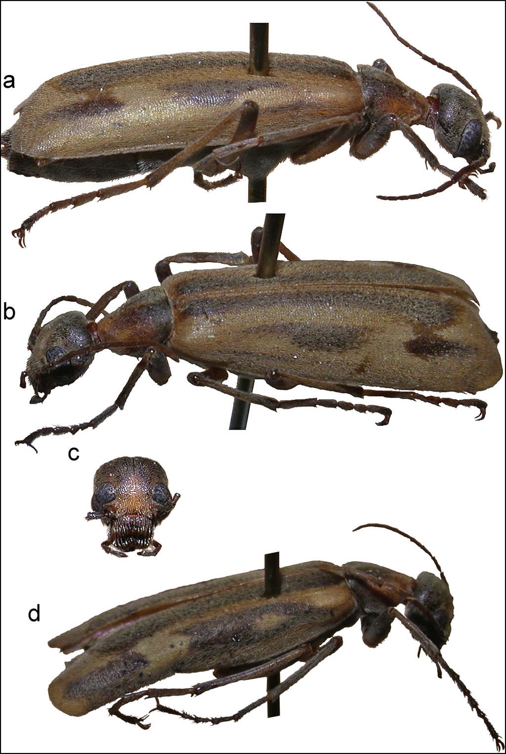 Descripción del holotipo: aspecto general estilizado y grácil. Longitud total: 12.9 mm; anchura máxima, situada un poco antes del ápice elitral: 4.4 mm. Cabeza, pronoto, élitros y patas con tegumento mate, de color ocre-amarillento con manchas y bandas oscuras más o menos extensas y límites poco definidos de color pardo achocolatado (fig. 1a, b). Antenas y región ventral de color pardo rojizo con zonas difusas oscurecidas. Pilosidad general amarillo blanquecina.