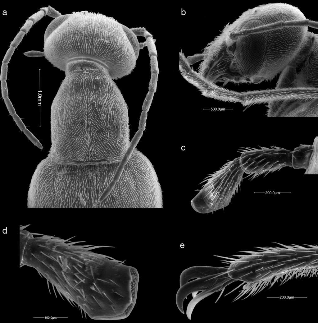 Cabeza de anchura similar a la de la base del pronoto, de 1.7 mm desde la sutura fronto-clipeal hasta el vértex y 1.9 mm de anchura entre las sienes. Sienes subparalelas, redondeadas hacia el vértex, de 0.7 mm de longitud (medida en visión lateral desde el margen posterior del ojo hasta el extremo de las mismas; figura 1c). Ojos grandes, de 1.15 mm de diámetro mayor y 0.65 mm de diámetro menor, prominentes, de contornos redondeados, rodeados por un reborde marcado y brillante, con una amplia escotadura interna que los divide en 2 lóbulos, el inferior de mayor tamaño y prolongado hasta la base de las maxilas. Distancia mínima entre ojos: 0.95 mm. Frente plana, de color ocre amarillento que se va transformando en pardo oscuro hacia las sienes y el vértex, con 2 elevaciones suaves situadas junto al borde interno del lóbulo superior del ojo y con un surco central, liso, fino y poco marcado que se extiende desde el centro de la frente hasta el vértex. Inserciones de las antenas apenas levantadas (figs. 1c, 2b). Sutura clípeo-frontal arqueada. Clípeo subrectangular, transverso, de 0.95 mm de ancho y 0.5 mm de largo, con el tercio anterior membranoso y liso, de color pardo rojizo (fig. 1c). Labro transverso, fuertemente bilobulado, con escotadura central bien marcada, de 0.9 mm de anchura máxima y 0.4 mm de longitud máxima, de color pardo obscuro en la región basal y pardo rojizo en la distal. Mandíbulas de color castaño con el ápice casi negro, fuertemente curvadas en su borde externo, que apenas sobresalen por debajo del labro. Punteado de la cabeza fino y muy denso, casi confluente, uniformemente repartido, un poco más denso en el disco de la frente, menos denso en el extremo posterior de las sienes y ausente en 2 pequeñas áreas lisas justo por encima de las inserciones de las antenas. Punteado del clípeo denso, constituido por puntos aproximadamente una vez y media más gruesos que los de la frente; zona membranosa sin puntos. Punteado del labro con los puntos similares a los del clípeo aunque un poco más impresos, distribuidos por los 2 tercios posteriores. Pilosidad de la cápsula cefálica densa, siguiendo el patrón del punteado en el que se inserta, constituida por pelos cortos blanquecino-amarillentos tumbados y aplicados contra el tegumento, dirigidos hacia delante. Clípeo con pilosidad casi el doble de larga que la de la frente, formada por pelos amarillo-blanquecinos semierectos y dirigidos hacia adelante, que sigue el patrón de los puntos en los que se inserta. Labro con pilosidad como la del clípeo, un poco más corta y más dispersa. Márgenes externos de la mitad proximal de las mandíbulas con algunos pelos un poco más cortos y tumbados que los del labro. Palpos maxilares alargados con el artejo basal (I) estrecho, subcilíndrico y muy corto; artejo II alargado, troncocónico con la máxima anchura en el extremo, 2.2 veces más largo que ancho; artejo III alargado, troncocónico, con la máxima anchura en el ápice, un poco más corto que el II, 1.7 veces más largo que ancho; artejo IV alargado, subtriangular, con la mayor anchura en el extremo, 2.2 veces más largo que ancho, ligeramente deprimido dorsoventralmente y con el ápice parcialmente truncado en oblicuo; en el ápice se marca una hendidura que deja al descubierto una zona sensorial; la pilosidad de los 3 últimos artejos constituida por pelos cortos, blanquecino-amarillentos similares a los del margen de las mandíbulas excepto el tercio apical del último artejo que es glabro (fig. 2c, d). Palpos labiales muy cortos con el último artejo subtriagular, fuertemente dilatado en el extremo, casi igual de ancho que de largo, casi glabros, con algunos pelos dispersos finos y cortos.
