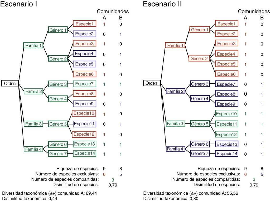 En un ejemplo hipotético, se comparan 2 comunidades ecológicas (A y B) bajo 2 escenarios diferentes de estructura taxonómica (I y II) (fig. 1). En ambos escenarios, las comunidades A y B tienen la misma riqueza de especies y el mismo número de especies compartidas y exclusivas, de manera que la disimilitud de especies entre comunidades en ambos escenarios es la misma (0.79). Sin embargo, al considerar la estructura taxonómica, en el escenario I la comunidad A tiene una diversidad alfa taxonómica más alta (69.4) que en el escenario II. Este valor es distinto debido a que sus 9 especies representan a 7 géneros contenidos en 4 familias, mientras que en el escenario II, las 9 especies de la comunidad A pertenecen a solo 3 géneros, agrupados en 2 familias. En este mismo ejemplo, considerando la estructura taxonómica, la disimilitud taxonómica entre la comunidad A y B cambia en cada escenario. Hay una menor disimilitud taxonómica en el escenario I (0.44) porque todos los géneros y familias se comparten entre las comunidades A y B. En tanto que en el escenario II el valor de disimilitud taxonómica es más alto (0.80) porque solo se comparte un género y una familia.