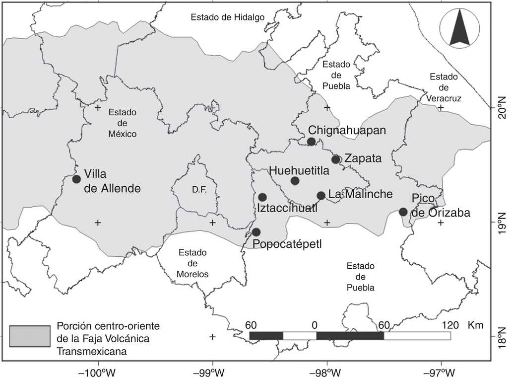 En México, la provincia biogeográfica más heterogénea y compleja en historia geológica y biótica es la Faja Volcánica Transmexicana (FVT), que se localiza principalmente entre los 19° y 21° de latitud norte, entre los 1,500 y 3,000 m de altitud, y forma una faja transversal extendida del Golfo de México al Océano Pacífico (Ferrusquía-Villafranca, 2007). Esta provincia queda incluida dentro de la Zona de Transición Mexicana y es reconocida como centro de diversificación, endemismo y transición para una gran variedad de taxones (Halffter, 2006; Gámez, Escalante, Rodríguez, Linaje y Morrone, 2012; Morrone, 2010). Se reconocen por lo menos 3 grandes sectores bióticos dentro de esta provincia: el sector occidental (Colima, Jalisco y Nayarit), central (estado de México, Hidalgo y Guanajuato) y oriental (Veracruz, Puebla y Tlaxcala). Es en esta última porción donde se localizan las montañas volcánicas de mayor altura del país: Pico de Orizaba (5,675 m), Popocatépetl (5,452 m), Iztaccíhuatl (5,286 m) y La Malinche (4,461 m), además de otras de menor altitud (Velasco-de León, Arellano, Silva-Pineda y Yussim, 2007). Entre los tipos de vegetación que ocupan la mayor extensión en esta provincia están los bosques de encino, pino, oyamel y sus diferentes asociaciones que cubren 30,764 de los 58,274 km2 de la provincia (Suárez-Mota, Téllez-Valdés, Lira-Saade y Villaseñor, 2013).