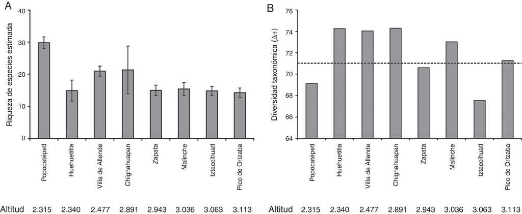 Con respecto a la diversidad taxonómica, 6 comunidades tuvieron un valor de diversidad taxonómica casi igual o mayor que el valor promedio esperado por azar (Δ+ = 71.2): Huehuetitla, Villa de Allende, Chignahuapan, Zapata, Malinche y Pico de Orizaba. Por el contrario, Popocatépetl (Δ+ = 69.13) e Iztaccíhuatl (Δ+ = 67.54) fueron comunidades que mostraron una diversidad taxonómica menor a la esperada (fig. 3B).