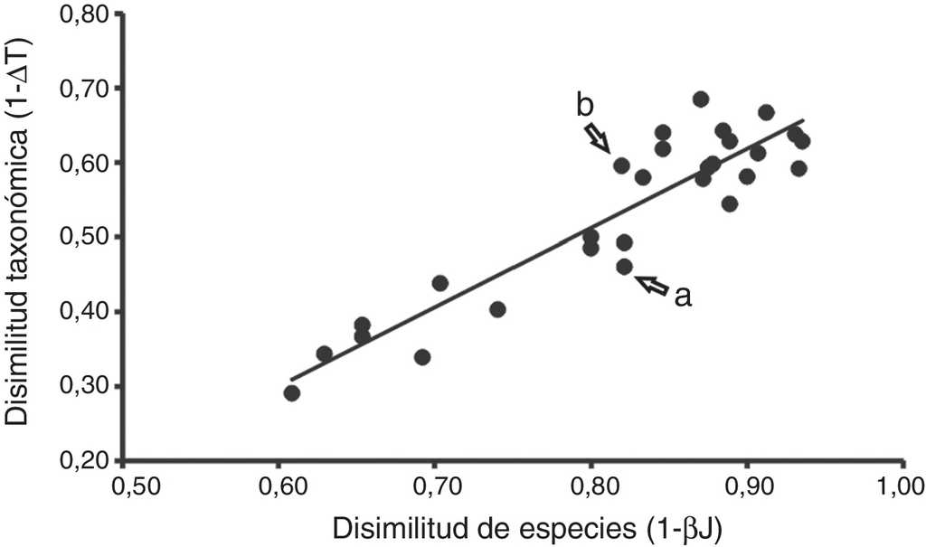 La disimilitud de especies (1-βJ) entre pares de comunidades tuvo valores entre el 61 y 94%, mientras que la disimilitud taxonómica (1-ΔT) varió del 29 al 68%. La relación entre los valores de disimilitud de especies (1-β) y disimilitud taxonómica (1-ΔT) fue estadísticamente significativa (r = 0.919, p < 0.001; fig. 4). Resultó interesante la distribución de valores como los que se ejemplifican en la figura 4: los puntos señalados como «a» (Iztaccíhuatl y Chignahuapan) y «b» (Villa de Allende y Popocatépetl), pues son pares de comunidades que presentan el mismo valor en disimilitud a nivel de especies (0.82), pero con valores diferentes de disimilitud en composición taxonómica (a = 0.46 y b = 0.60).