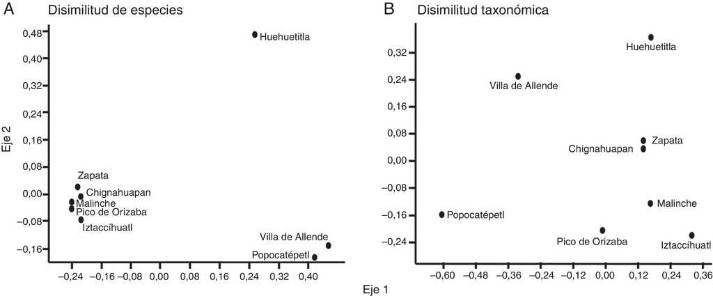 El resultado del análisis de ordenación mostró que las comunidades de escarabajos de Zapata, Chignahuapan, Malinche, Pico de Orizaba e Iztaccíhuatl, son muy parecidas en su composición de especies, en tanto que Villa de Allende y Popocatépetl, forman un grupo diferente. Huehuetitla es la comunidad con mayor disimilitud con respecto a las comunidades antes mencionadas (fig. 5A). En relación a la disimilitud taxonómica Pico de Orizaba, Malinche e Iztaccíhuatl mostraron diferencias notables, pero Zapata y Chignahuapan se mantuvieron cercanas con baja disimilitud taxonómica (fig. 5B). No se detectó un decaimiento de la similitud en la relación con la distancia geográfica a nivel de especies y tampoco a nivel de disimilitud taxonómica (r = 0.270, p = 0.20 y r = 0.331, p = 0.19, respectivamente) (fig. 6 A, B).