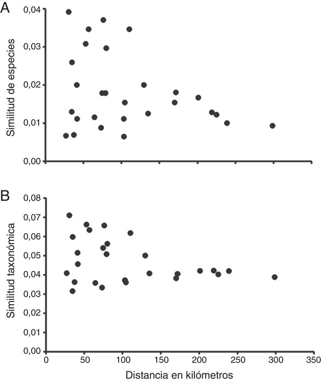 Uno de los patrones mejor conocidos de la diversidad beta es el decaimiento de la similitud con la distancia geográfica (Nekola y White, 1999; Soininen, McDonald y Hillebrand, 2007). Esto significa que 2 comunidades podrían ser poco similares en cuanto a su composición de especies simplemente por la distancia que hay entre ellas, y no por su historia evolutiva, i.e. por su estructura taxonómica. Para detectar una posible influencia de la distancia geográfica en la disimilitud, en este trabajo se calculó también la relación entre la similitud de especies (βJ) y la similitud taxonómica (ΔT) con la distancia lineal promedio en kilómetros entre pares de comunidades, a través de correlaciones de Mantel. La medición de las distancias geográficas se realizó a partir del centro del área cubierta por todos los sitios de muestreo para cada estudio faunístico.