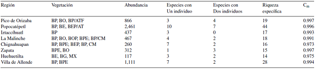 Una vez que se estandarizaron los inventarios de las 8 comunidades de escarabajos a una misma cobertura de la muestra (Cm = 0.985), se observó que en el Popocatépetl se espera el mayor número de especies (29.8), siendo esta una riqueza significativamente diferente con el resto de las comunidades. Le siguen en riqueza Chignahuapan (21.3) y Villa de Allende (20.9). El resto de las regiones (Huehuetitla, Zapata, La Malinche, Iztaccíhuatl y Pico de Orizaba) presentaron una riqueza de especies comparativamente bajas (de 14.2 a 15.4 especies), sin diferencias estadísticas significativas entre ellas (fig. 3A).