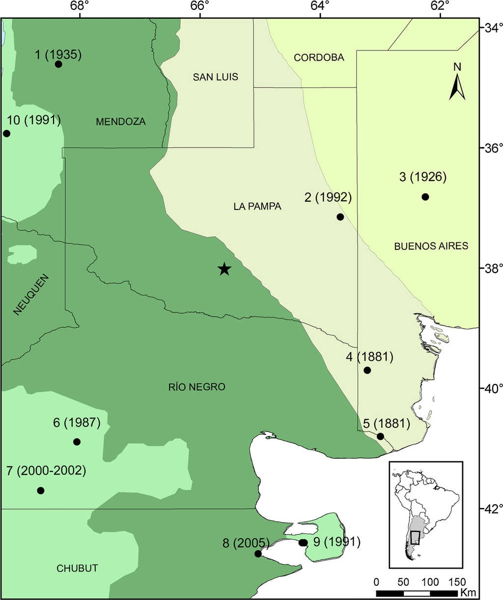 Potential distributional models based on recent (i.e., not fossil) data show a large high-prediction area for L. patagonicus in west-central Patagonia and other minor high-prediction areas that appear scattered in western Argentina and Chile (Schiaffini et al., 2013). Within this context, our record is not included in the current potential models generated by Schiaffini et al. (2013), a circumstance that merits some consideration. At least in part, this situation is the result of the low number of recent records (i.e., posterior to 1950) for this species in the Low Monte and Espinal. With the evidence at hand we cannot hypothesize if this situation reflects the absence of fieldwork by scientists in these areas, if it is the result of naturally low densities of this species in these ecoregions, or both (see Prevosti et al., 2009; Schiaffini et al., 2013). In contrast, potential distributional models based on Pleistocene and Holocene records made by Schiaffini et al. (2013), indicate that L. patagonicus occupied, under the more severe climatic conditions of these times, a broad area throughout central-eastern Argentina, including the Pampas, Espinal, and Low Monte. Thus the possibility that some populations in these ecoregions were relicts of a past, broad distribution, cannot be discarded.