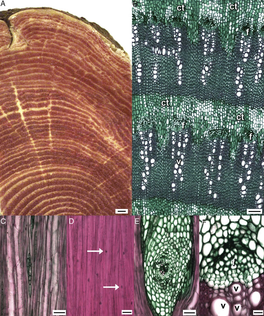 The number of concentric secondary xylem rings is highly variable between samples, and the larger the stem diameter, the higher the number of secondary xylem rings (Fig. 3A), except for sample 3, which had fewer rings. In the 3 samples, the first 8 secondary xylem rings have a width of at least 1 mm. However, in sample 1, secondary xylem rings of 1 mm in width are present between the intermediate secondary xylem rings (Fig. 3A). The secondary xylem rings closer to the stem periphery were the narrower ones (<0.4 mm), and the separation between them is minimal, joining a vascular ring to another through parenchyma cells, which anastomose.