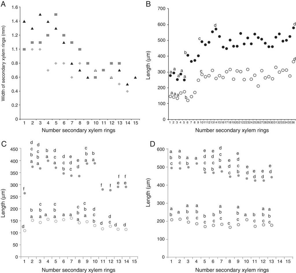The length was almost constant in 2 samples, with no apparent differences between most of the secondary xylem rings (p > 0.05, Tukey), and differences between most secondary xylem rings were found only in sample 1, in which the length increased from pith to periphery (Fig. 3B-D).