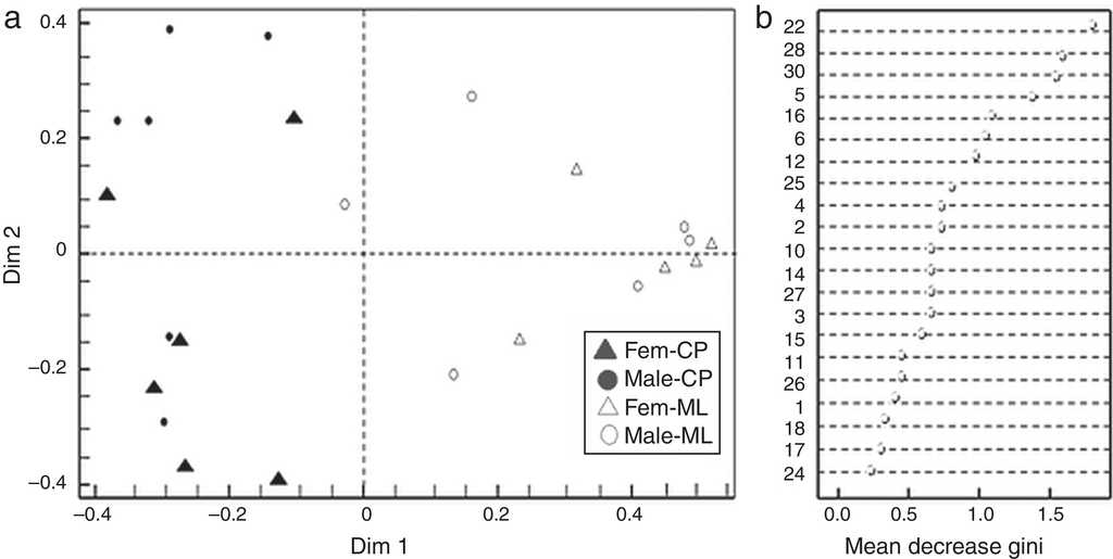 The coordinate analysis between the locations and the group of flowers (Fig. 1a) showed that Dim1 explained the discrimination in female flowers (x axis) and the male flowers from CP (y axis), meanwhile Dim 2 explained the geographical separation of the group of flowers (flowers from CP in the left side, and flowers from ML in the right side), where female and male flowers from ML were more similar.