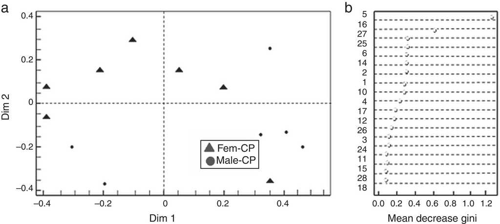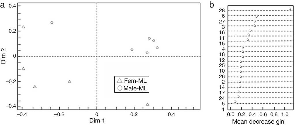 Based on the Gini index revealed that linalool was the compound that best differentiated flower sexes in CP, followed by β-cubebene and dendrolasin (Fig. 2b). The coordinate analysis explained the 99.39% of Dim 1 and Dim 2 contribution (Fig. 2a). In contrast, (3Z)-hexenyl benzoate differentiated flower sexes in ML, followed by 2-ethenyl-1, 1-dimethyl-3-methylene-cyclohexane, dendrolasin and (cis)-furanoid linalool oxide (MDS, Fig. 3b). The principal coordinate analysis in RF, explained 95.90% of Dim 1 and Dim 2 contribution (MDS Fig. 3a). The confusion matrix showed that female flowers were 80% correctly classified, and male flowers 84%, respectively.