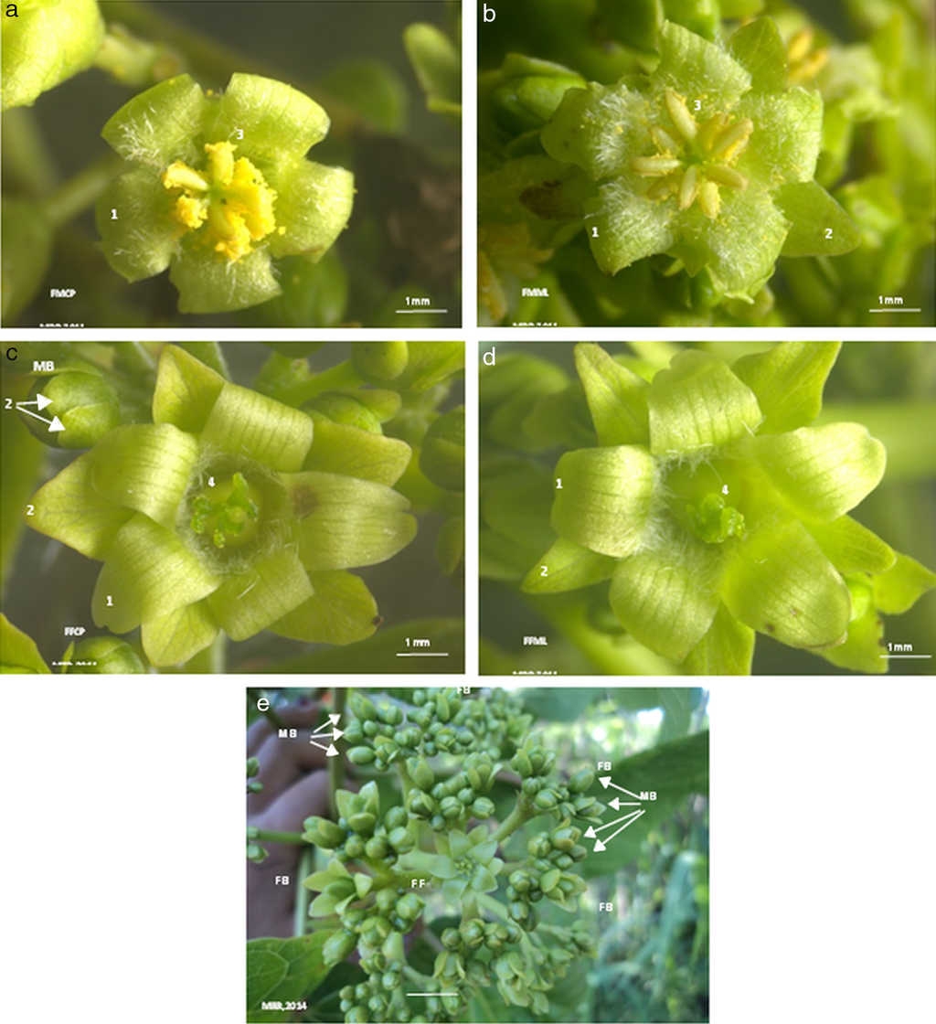 We observed that female flowers opened first (48 h before) than male flowers (Fig. 4a-e), also that some inflorescences had only male flowers; male flower number was higher (39-195 flowers) than female flowers (0-18 flowers) (p < 0.001). We did not find significant differences in the number of male flowers in both study sites (CP, 123.5 ± 60.5; ML, 147.2 ± 56.7; p > 0.05), or in female flowers (CP, 7.6 ± 4.4; ML, 8.7 ± 5.3; p > 0.05). Particularly, in this region of southern Mexico we observed that J. curcas flowers opened at 08:00 h, with a maximum aperture of female (64.29%) and male flowers (55.75%) at 09:00 h; first female flowers opened (for 8 days), and then after the second day of female flowers opening, male flowers started (for 13 days) (Ovando-Medina et al., 2014).