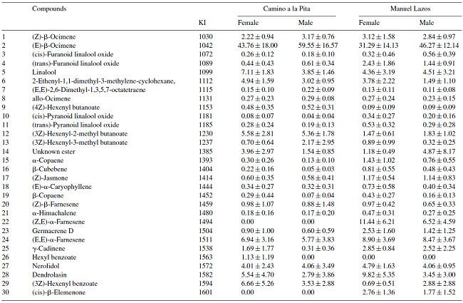 Chemical variation between populations may be the result of adaptation to local pollinators, thus chemical constancy of the floral scent within a population would be maintained (Azuma et al., 2001). These chemical differences could be also related to environmental conditions (temperature, humidity and light intensity), and genetic variation. In particular, in the Soconusco region, Ovando-Medina, Sánchez-Gutiérrez et al. (2011) and Salvador-Figueroa et al. (2014), reported a greater variation within populations from this study area, in contrast with worldwide populations.