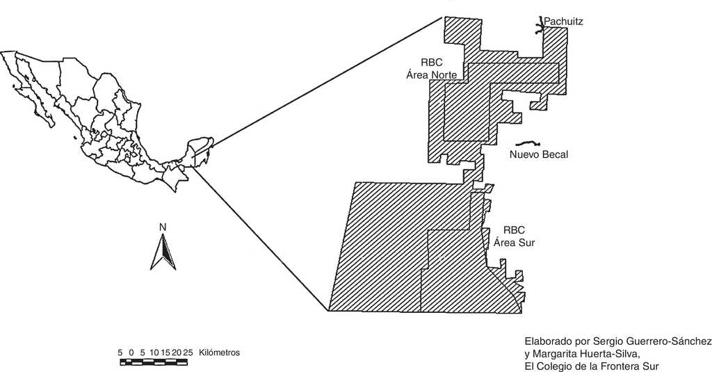 El presente trabajo se realizó en 2 comunidades aledañas a la Reserva de la Biosfera de Calakmul: Pachuitz y Nuevo Bécal (fig. 1), que son representativas de la totalidad de la Reserva. El ejido de Pachuitz (19°08'48'' N, 89°14'56'' O) se ubica en la región de La Montaña, en el municipio de Hopelchén. Esta región se encuentra en la parte norte de la Reserva de la Biosfera de Calakmul y recientemente se ha establecido como área focal del Corredor Biológico Mesoamericano-México, lo que quiere decir que a nivel mundial se considera como un lugar especial por sus recursos naturales (Porter-Bolland, Sánchez y Ellis, 2008). La comunidad Nuevo Bécal está situada en el municipio de Calakmul (18°36'35'' N, 89°18'09'' O). Posee una extensión territorial de 520.00 km2 (Inegi, 2008) y es el segundo ejido más grande del municipio de Calakmul.