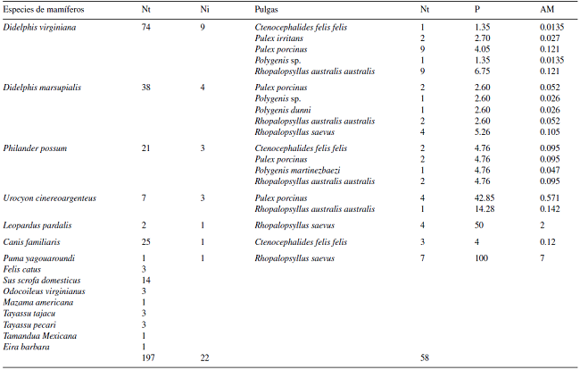 De los 197 individuos de mamíferos examinados, solo 22 (11.16%) de ellos tuvieron pulgas, obteniendo un total de 58 individuos, los cuales pertenecen a 4 géneros y 7 especies de 2 familias (Pulicidae y Rhopalopsyllidae). Las pulgas más abundantes fueron Pulex porcinus y Rhopalopsyllus australis australis, mientras que los mamíferos de talla pequeña fueron los que tuvieron un mayor número de especies de pulgas (tabla 1).
