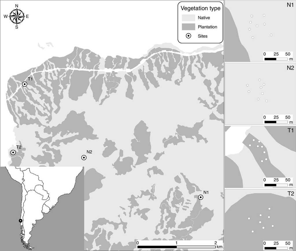 We conducted this research at the Valdivian Coastal Reserve (39°57' S, 73°34' W), a private protected area of The Nature Conservancy (Delgado, 2010), which falls within a biodiversity hotspot (Myers, Mittermier, Mittermier, da Fonseca, & Kent, 2000). This Reserve protects 50,530 ha of Valdivian temperate rainforest (∼50% of this ecosystem in Chile). This highly threatened biodiversity hotspot coexists with exotic plantations (currently occupying ∼200,000 ha of that ecosystem), which are continuously encroaching and replacing native habitats. Nevertheless, little is known about bird diversity in productive lands (either current or abandoned) in this ecosystem. Since part of the land that the Valdivian Coastal Reserve currently occupies was previously owned by forestry companies, it includes 2 major vegetation types: (1) native stands dominated by Nothofagus spp. trees and a diverse understory vegetation, and (2) abandoned plantations of the exotic tree Eucalyptus globulus (planted 12-20 years ago; never managed or harvested; occupying ∼12,000 ha) with abundant native understory vegetation regrowth. Those vegetation types are neighboring and highly intertwined, as fragmentation is negligible; therefore, there are no non-forested areas among them. Detailed information of the study site is available on Fontúrbel et al. (2015). Native vegetation is dominated by Nothofagus dombeyi, N. pumilio and Eucryphia cordifolia as canopy species, whereas the exotic E. globulus is the only canopy species present at the plantation site. Understory vegetation in the native stands is dominated by Laurelia philippiana, Lomatia ferruginea, Drimys winteri, and Mitraria coccinea, with sparse patches of the native bamboo Chusquea quila and a few Lapageria rosea vines. At the plantation sites, understory vegetation is dominated by Aristotelia chilensis, Rhaphithamnus spinosus, Ugni molinae, Luma apiculata, thick C. quila patches, and abundant L. rosea vines climbing on the E. globulus trunks.