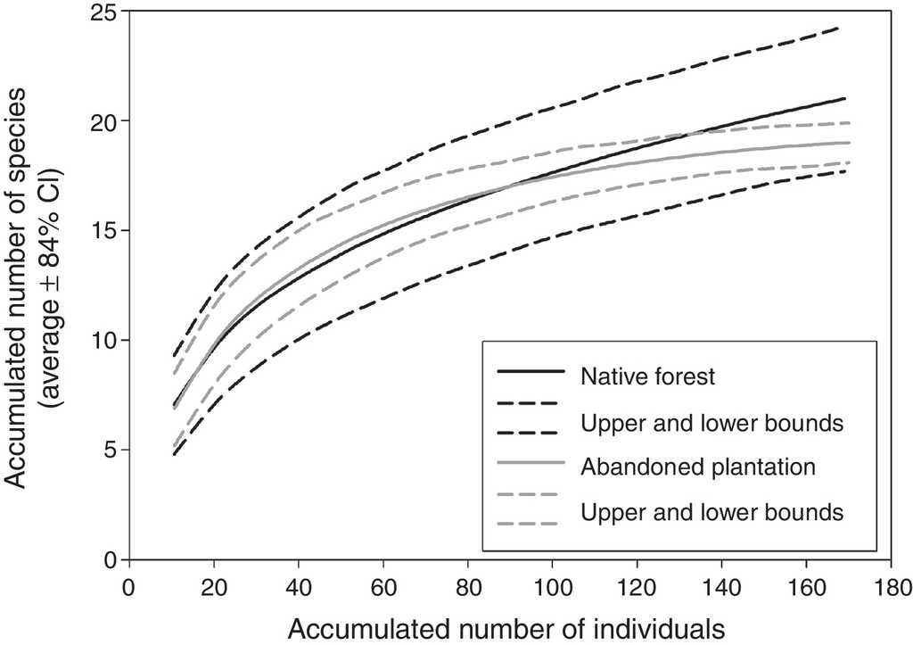 We recorded 21 species at the study area. Twenty-one species were present at the native stands, whereas 19 species were found at the abandoned plantation (Table 1). Rarefaction curves, based on the number of individuals, show that mean species richness values between both vegetation types are not statistically different, as both rarefaction curves (and their 84% confidence intervals) overlapped at the same number of records (Fig. 2). The mean number of individuals registered did not differ between the native vegetation and the abandoned plantation (F 1,28 = 0.27; p = 0.608). Most frequent species were the Chucao Tapaculo (Scelorchilus rubecula) at both native forest (22.7% and 25.6% of the records) and abandoned plantation (18.4% and 22.2%) vegetation types; the Green-backed Firecrown hummingbird (Sephanoides sephaniodes; 9.1% and 15.9% at native vegetation stands, and 11.2% and 8.3% at plantation sites), and the White-crested Elaenia (Elaenia albiceps; 11.4% and 12.2% at native vegetation stands, and 17.3% and 18.1% at plantation sites).