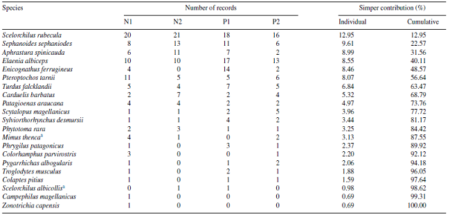 Bird assemblage composition differences between vegetation types was assessed using a one-way analysis of similarity (Anosim), which is a non-parametric test based on permutations that compares within- and between-group similarities, working similarly than an Anova test to compare species composition among groups (Clarke, 1993). Anosim was conducted using the Bray-Curtis distance, a count-based measurement widely used in comparisons of bird communities (Barlow et al., 2007; Fontúrbel & Jiménez, 2014). Complementarily, we used a similarity percentage (Simper) test to rank species in a decreasing similarity degree of the Anosim test. Anosim and Simper tests were performed using PAST 2.15 (Hammer, Harper, & Ryan, 2001).