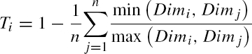 donde Ti = grado de diferenciación en diámetros o/y alturas, j = 1. . . n árboles vecinos, i = árbol de referencia, Dimi = diámetro o altura del árbol i, Dimj = diámetro o altura del árbol j.