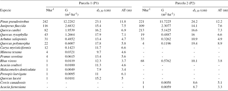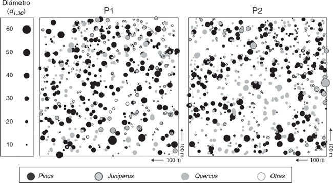 Los resultados se presentan por parcela (incluyen a todos los individuos) y con base en grupos de acuerdo con los géneros Pinus, Quercus y Juniperus, por ser los más abundantes y con mayores dimensiones (tabla 1). En la figura 1 se observa la distribución espacial del arbolado por grupo en las parcelas P1 y P2.