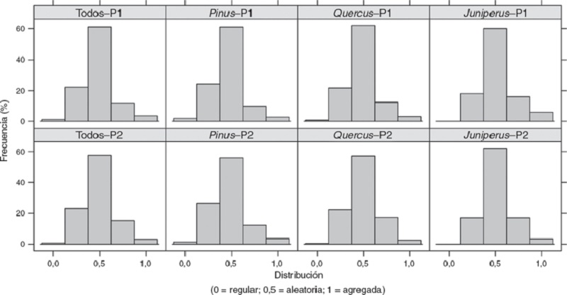El análisis por promedio de cada grupo muestra también tendencia a distribución aleatoria del arbolado sin que se presente una diferencia significativa entre las parcelas. Para el grupo Pinus se tienen promedios de 0.47 (± 0.18) y 0.48 (± 0.19) para P1 y P2, respectivamente; para Quercus con 0.49 (± 18) y 0.50 (± 18) y para Juniperus 0.53 (± 0.19) y 0.52 (± 0.17), siendo estos últimos los que presentan una ligera tendencia a la agregación. En la figura 2 se puede observar que la mayor frecuencia de grupos estructurales se encuentra en la categoría de 0.5, que coindice con el análisis generalizado por parcelas. Esto quiere decir que 2 de los 4 árboles vecinos tienen un ángulo menor a 90°; esta distribución indica que la mayoría de los grupos se encuentran en la categoría de distribución aleatoria.