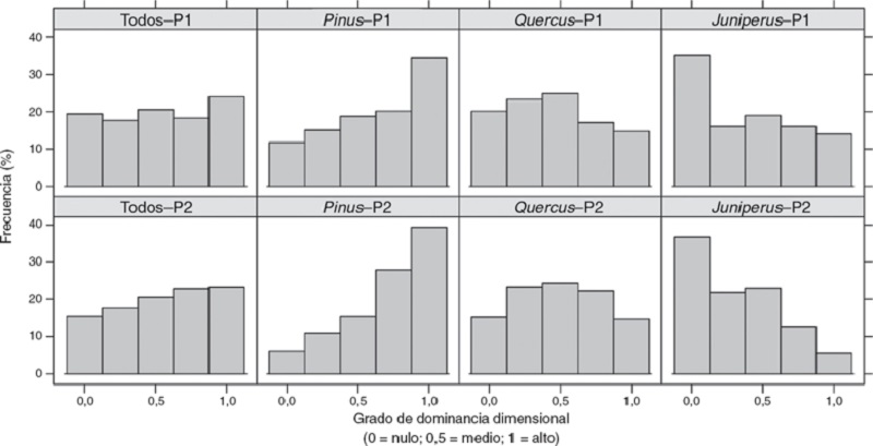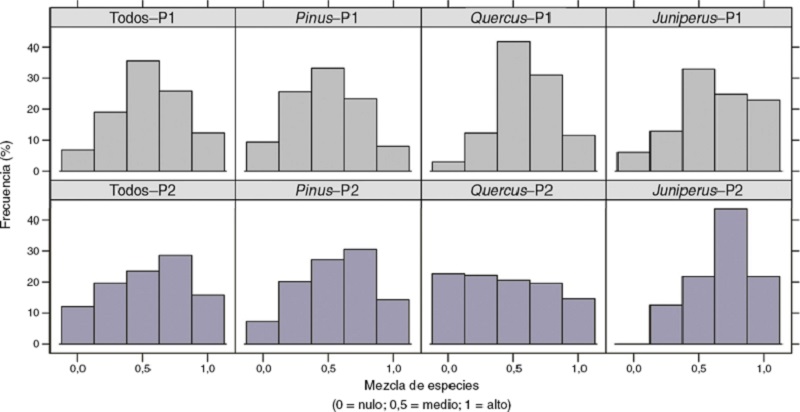 Los gráficos de distribuciones del grado de mezcla (Mi) por grupos concuerdan con los promedios generales (fig. 3). El grupo Pinus tiene su mayor frecuencia en la categoría de 0.50 y en la de 0.75 para P1 y P2, respectivamente, lo que indica que existe un mayor grado de mezcla del género en la P2. En el caso de Quercus, las distribuciones muestran algunas diferencias, en la P1 la categoría que domina es la de 0.50, en tanto que en la P2 no se observa mucha diferencia en la distribución. Para el caso de Juniperus en la P1, la categoría que presenta mayor proporción es la de 0.50 y para la P2 la categoría de 0.75 muestra un mayor porcentaje (> 40), indicando un mayor grado de mezcla del género en la P2.