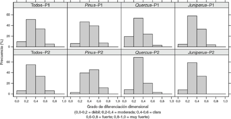 En la figura 4 se pueden observar las distribuciones de las frecuencias en diferenciación diamétrica por grupo. Para el grupo Pinus, en P1, la categoría más representada es la moderada, y para P2, la clara, lo cual indica mayor diferenciación en P2. Para el grupo de los Quercus, se observa la categoría moderada con mayor frecuencia para las 2 parcelas, solo que en la P2 tiene mayor proporción; el grupo Juniperus, es muy similar en su distribución, también presentan en la categoría moderada la mayor frecuencia (60%).