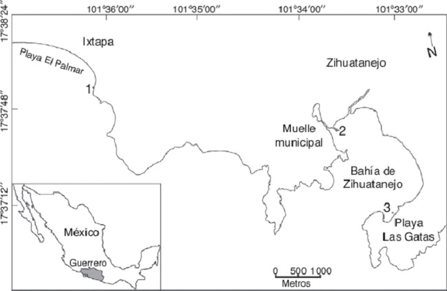 Se realizaron 4 salidas de campo a las 3 localidades del intermareal rocoso en la zona de Ixtapa-Zihuatanejo: playa El Palmar (17°39’0.4” N, 101°36’2.79” O), muelle municipal (17°38’13.88” N, 101°33’31.87” O) y el pretil de playa Las Gatas (17°37’22.07” N, 101°33’04.85” O), en enero, mayo, julio y noviembre de 2014. En cada localidad se recolectaron 3 muestras de 20 × 20 cm, para cada nivel de marea: intermareal bajo, medio y alto; se tomaron un total de 108 muestras.