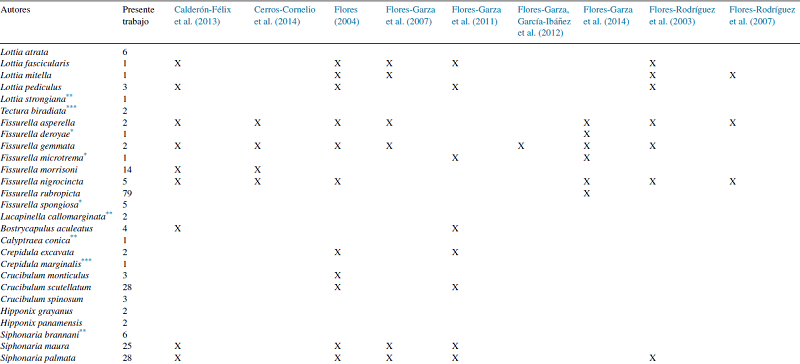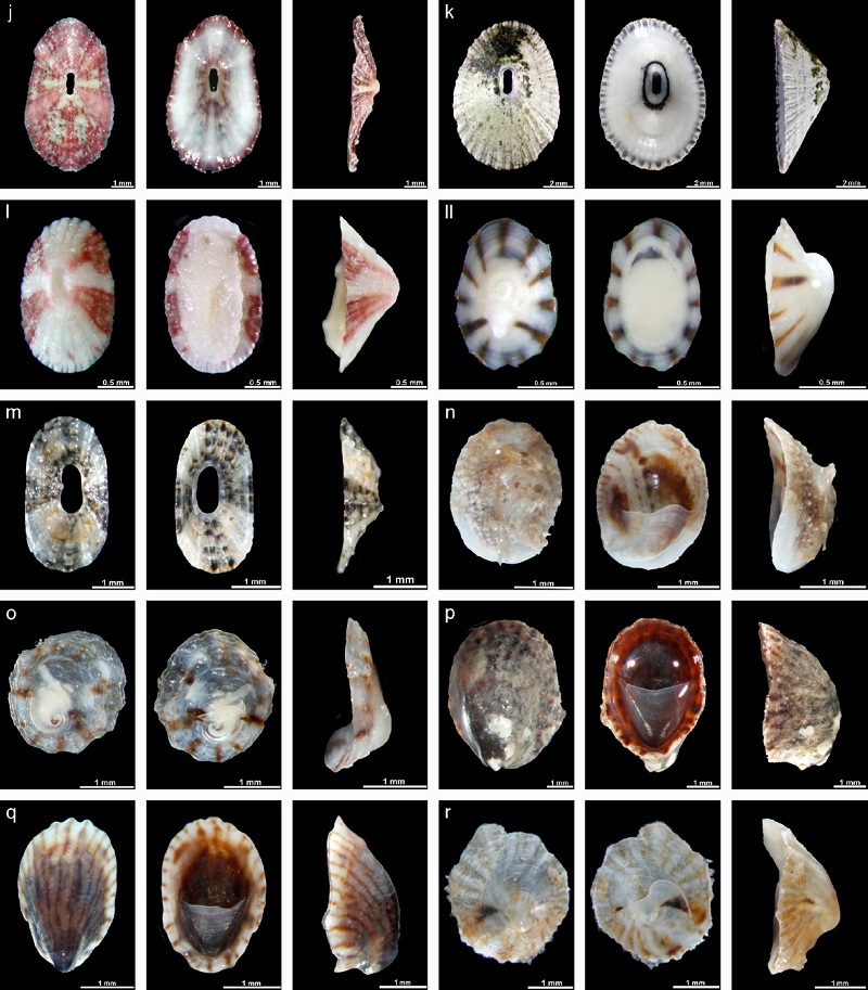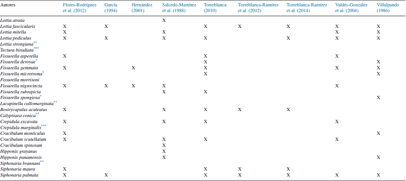 De las 34 especies encontradas en este estudio, fueron nuevos registros Fissurella deroyae, F. microtrema, F. spongiosa, Lottia strongiana, Lucapinella callomarginata, Siphonaria brannani, Crepidula marginalis, Calyptraea conica y Tectura biradiata, mientras que Fissurella morrisoni solo se localizó en la parte norte del estado de Guerrero (tabla 1).