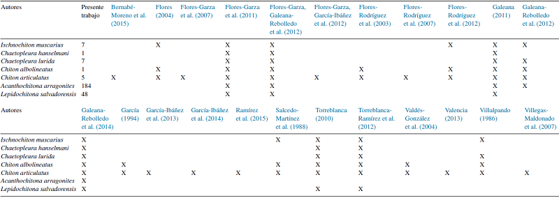 En la parte norte del estado, incluida la zona de Ixtapa-Zihuatanejo, se han realizado estudios generales con la malacofauna (Calderón-Félix, Flores-Garza, Flores-Rodríguez y García-Moctezuma, 2013; Cerros-Cornelio, Flores-Garza, Flores-Rodríguez y García-Moctezuma, 2014; Flores, 2004; Flores-Rodríguez, Flores-Garza, García-Ibáñez y Valdés-González, 2007; Salcedo-Martínez, Green, Gamboa-Contreras y Gómez, 1998), donde se incluye a los gasterópodos, bivalvos y poliplacóforos. No obstante, en ninguno de los trabajos descritos anteriormente se menciona la condición de madurez de los gasterópodos pateliformes y quitones, aun cuando es clara la presencia de datos morfológicos que así lo sugieren.