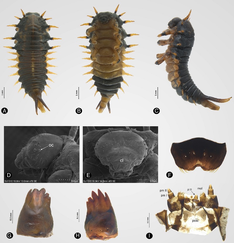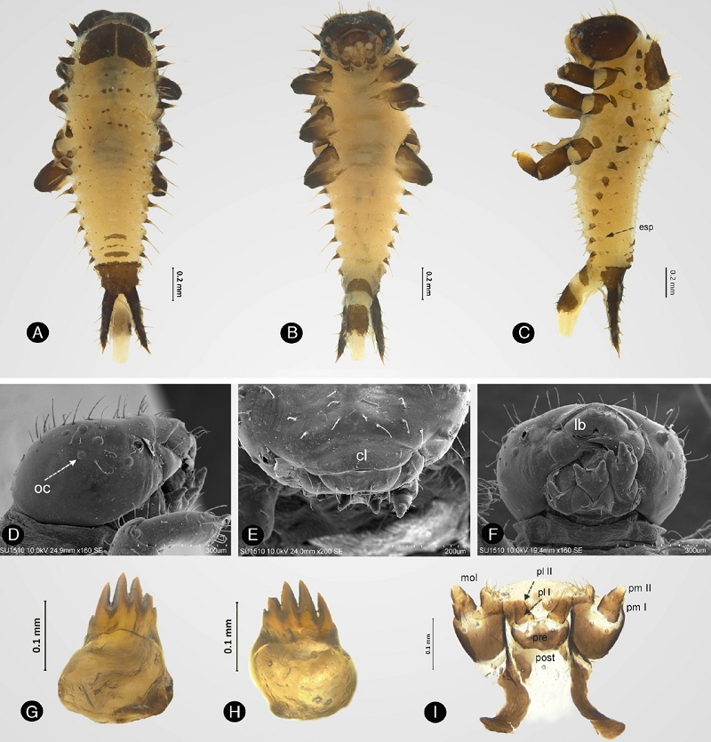 Cabeza. Esclerosada, hipognata, retraída hacia el pronoto, cubierta de sedas distribuidas en toda la cabeza; sutura media completa conectada con la sutura del clípeo. Seis ocelos presentes a cada lado (fig. 2D). Antenas con 2 segmentos, el primero más ancho que el segundo. Clípeo glabro, más ancho que largo (fig. 2E). Labro liso, emarginado, más ancho que largo, con 8 sedas gruesas en los costados del margen anterior y 4 sedas en la superficie dorsal (fig. 2F). Mandíbula fuertemente esclerosada, con 6 dientes cónicos (fig. 2G, H). Palpo maxilar y labial conados (fig. 2I). Estipe con una seda larga y 4 cortas; mola con ápice truncado y 9 sedas con ápice agudo; palpo maxilar con 2 artejos, el primero con una seda en cada costado, el último con una agrupación de sensilas en el ápice; palpo labial con 2 artejos, el último con una agrupación de sensilas en el ápice; prementum con 4 sedas cortas dorsalmente; posmentum con 2 sedas largas y 4 cortas.