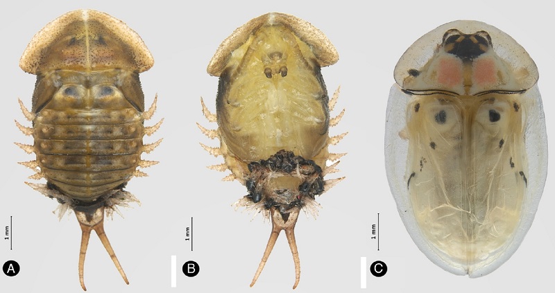 Medidas (n = 4; [mm]). Longitud total: 9.09, 8.18, 8.63, 8.63. Ancho (segundo segmento abdominal): 3.36, 3, 3.36, 3.18. Largo del pronoto: 1.8, 1.6, 1.8, 1.8. Ancho del pronoto: 4.27, 3.90, 4.27, 4.